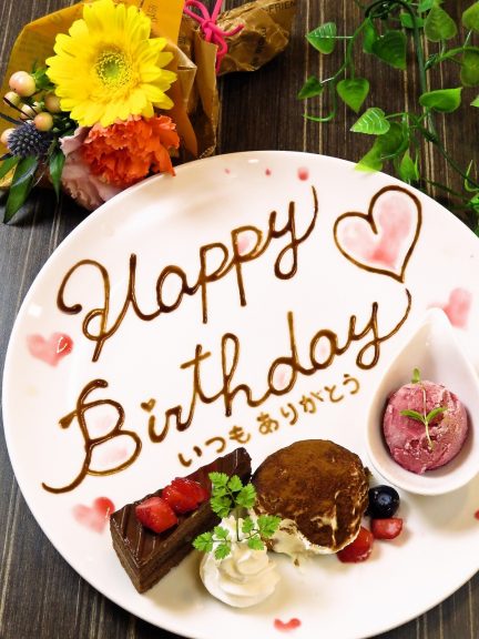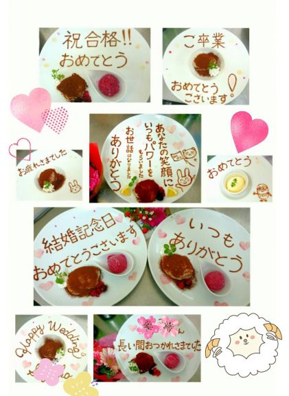 誕生日、記念日、歓送迎会などにメッセージ付きのプレートでサプライズをお手伝い致します♪(無料・ランチも可)